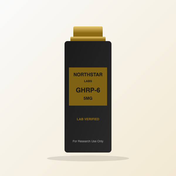 GHRP-6 (Growth Hormone Releasing Peptide-6) is a hexapeptide that stimulates GH release through the ghrelin receptor. 5mg lyophilized powder, ≥99% purity by HPLC.